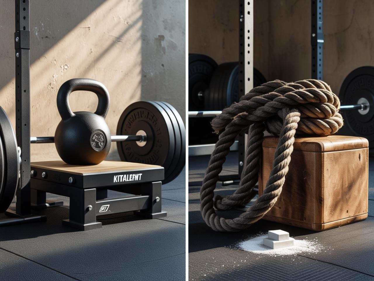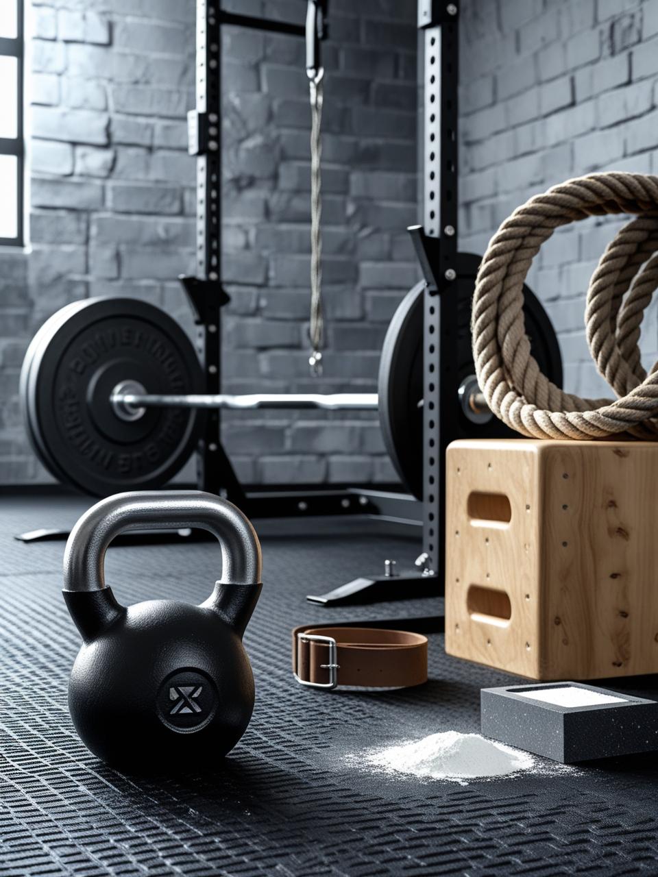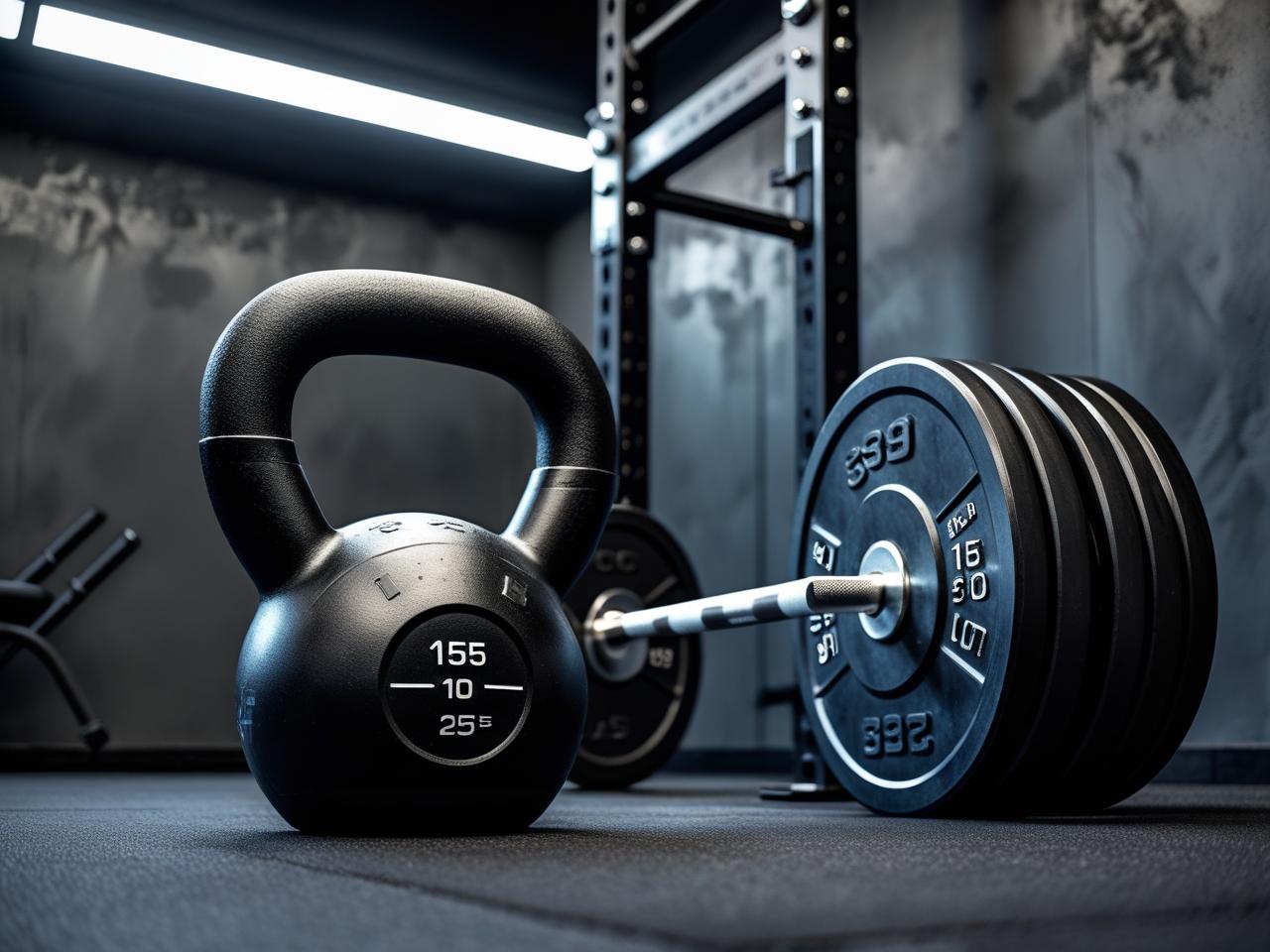 Durable kettlebells, barbells, and plyometric tools designed for strength and endurance training.
